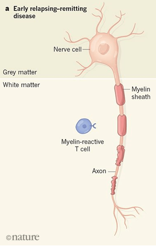 As you may know, multiple sclerosis (MS) is an autoimmune disease characterized by the destruction of nerve cells, and is usually diagnosed at an early stage called ‘relapsing-remitting multiple sclerosis’ (RRMS). In this stage you would experience unpredictable periods of symptoms followed by periods in which the symptoms fade. A lot of progress has been made in finding what exactly happens in your body at this stage, by using a mouse model called experimental autoimmune encephalomyelitis (EAE). Nowadays, it’s generally known that immune cells, mainly your T cells and macrophages, attack the white matter in your brain and spinal cord. The main target of your immune cells is a mixture of lipids and proteins named myelin, which protects your nerve fibres or axons of your nerve cells. The breakdown of this protective layer affects the transfer of signals, causing the typical symptoms of RRMS.