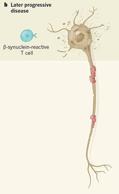 In contrast to white matter, grey matter doesn’t contain myelinated axons, but your nerve cells’ cell bodies. These cell bodies contain the genetic material and are essential for the processing of signals. The breakdown of this cell-part is probably what causes your nerve cells to lose their function. Lodygin and his colleagues used a rat model to compare different kinds of migrating T cells: those that target myelin and those that recognize a protein called β-synuclein. This protein is typically present in the junctions between your nerve cells, which we like to call synapses, and has the purpose of regulating endocytosis (basically that which allows your cells to eat and drink). This study confirmed that myelin-reactive T cells are present in your myelin-rich white matter and that T cells that recognize β-synuclein cause permanent damage mainly in your grey matter. So we can conclude that β-synuclein might be a late-stage autoimmune target.