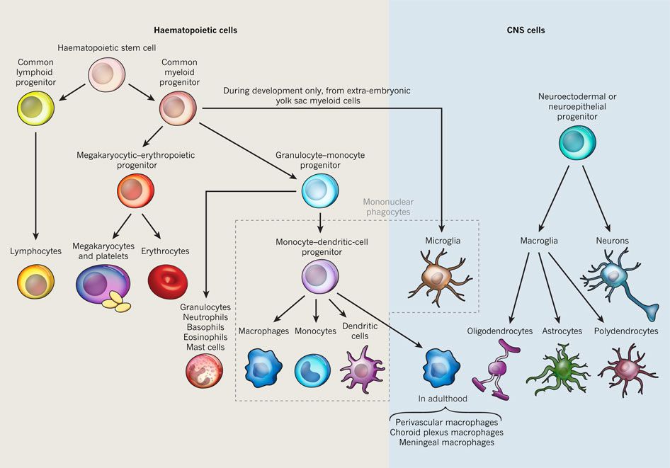 When it comes to multiple sclerosis (MS), there are lots of different cell-types damaging your nerve cells, most of them being myeloid cells. Some of these myeloid cells occupy your central nervous system (CNS), such as microglia and CNS-associated macrophages (CAMs). Both of these cells play a role in maintaining homeostasis. Other myeloid cells, immune cells like monocytes and dendritic cells, start to invade your CNS at the early stages of MS or experimental autoimmune encephalomyelitis (EAE). Also lymphocytes are involved in the breakdown of your nerve cells.